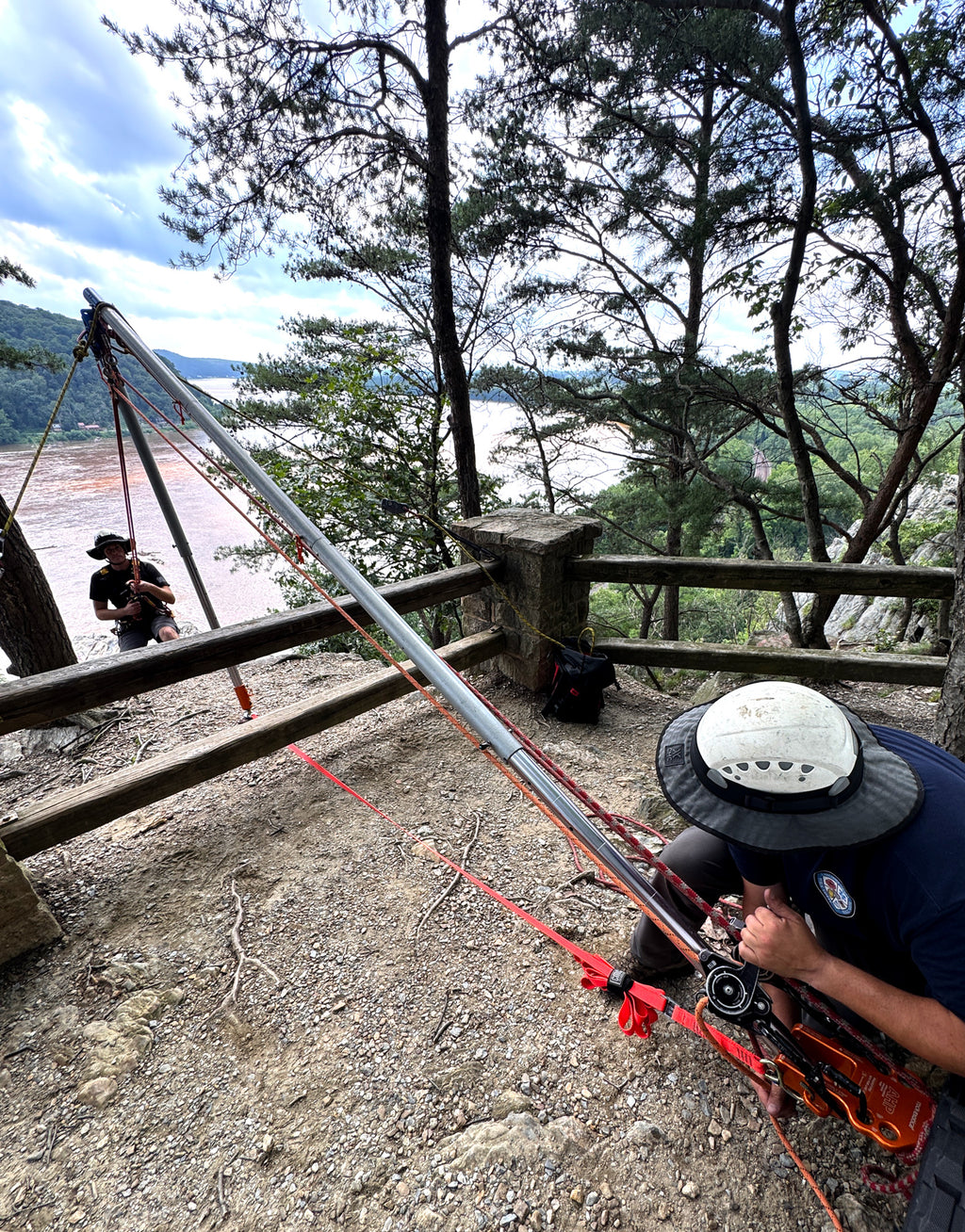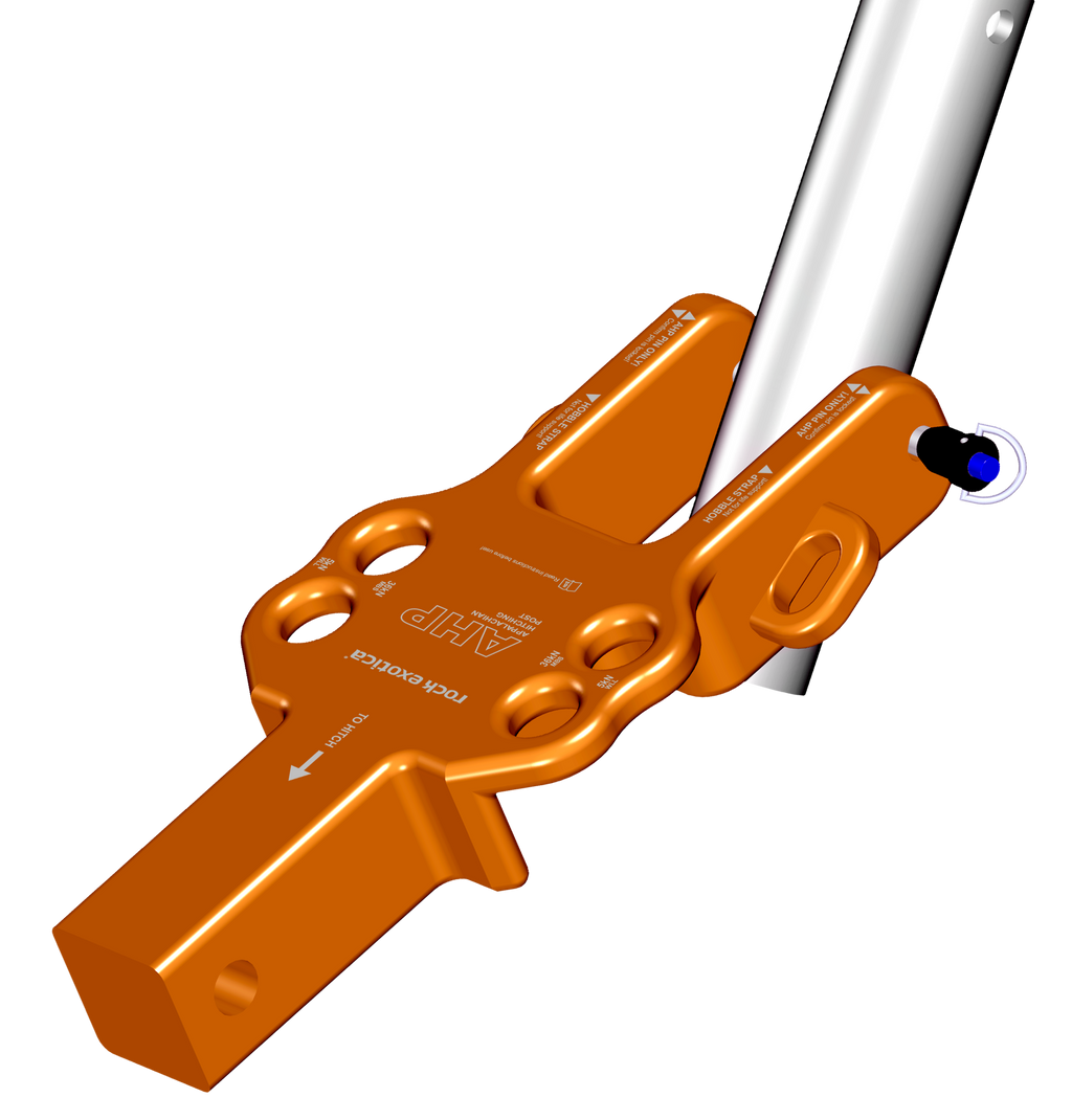 The Appalachian Hitching Post (AHP) is a vehicle-mounted interface designed to securely anchor a leg section of the Vortex. It is compatible with any of the approved configurations outlined in the Vortex user manual, provided the specific rigging principles for each configuration are followed. The AHP further facilitates placement of the Vortex with the optional 90° Hitch Adapter, allowing for vehicle placements perpendicular to the edge. Both the AHP and the 90° Hitch Adapter are designed for use with 2" receiver hitches. With a rating at 36 kN, the AHP is suitable for anchoring the Vortex with a standard two-rope system, as well as providing additional anchor points for re-directs or primary connection points. The AHP comes with a push pin to connect the Vortex leg and 5/8" hitch receiver pin. The AHP 90° Adapter comes with a push pin to connect to the AHP.